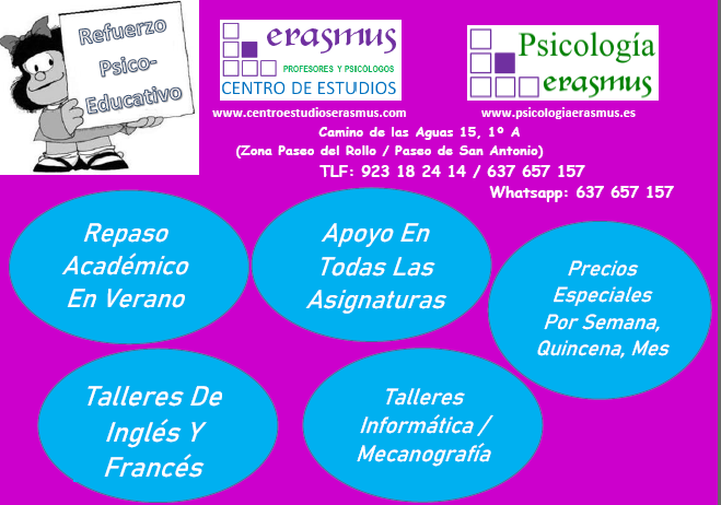 comenzamos nuestras clases de apoyo psicopedágogico para afrontar el nuevo curso escolar 2023 - 2024. Les ayudaremos en sus tareas diarias, repasar y afianzar los conocimientos; así como a preparar los exámenes del curso. En el Centro Estudios Erasmus mantenemos las medidas preventivas de distanciamiento social, uso de hidrogel y mascarilla.